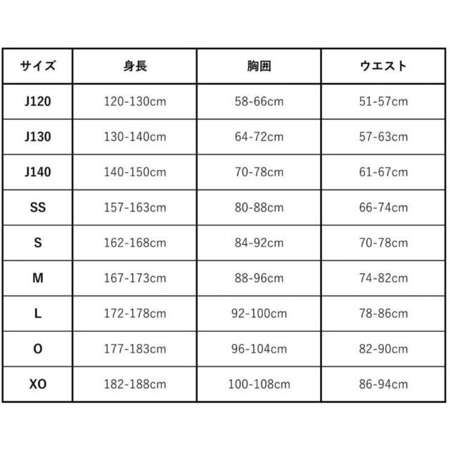 ・XO:(身長)182-188cm/(胸囲)100-108cm/(ウエスト)86-94cm